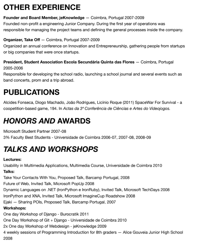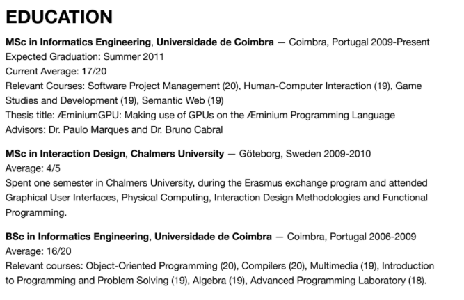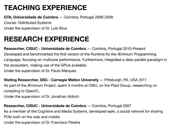 Over the last couple of years, I have spent a significant amount of time browsing and scoring resumés (Vitae is the common name in Portugal) for different positions, both in academia and industry. The majority of those had been poorly designed. In this post, I try to help you design the perfect resumé, and avoid common pitfalls. While this is designed towards Software Engineering, you might find this relevant for other areas.
